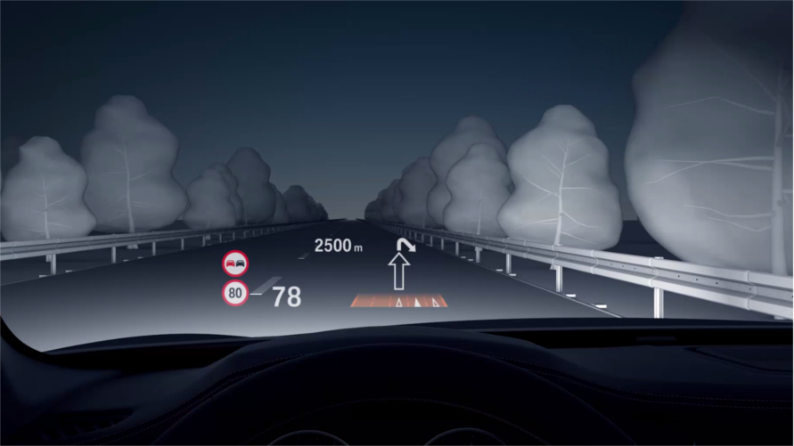 L’Affichage Tête Haute HUD couleur affiche, par le biais d’un système de projection optique, toutes les informations importantes pour la conduite dans le champ de vision du conducteur pour lui permettre de rester concentré sur la route. Les données telles que la vitesse s'affichent, ainsi que des astuces de navigation, l'identification des panneaux de signalisation dont l'affichage d'interdiction de doubler, le téléphone et des listes de divertissement, les informations et les avertissements des divers systèmes d'assistance du conducteur.